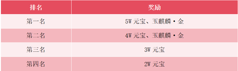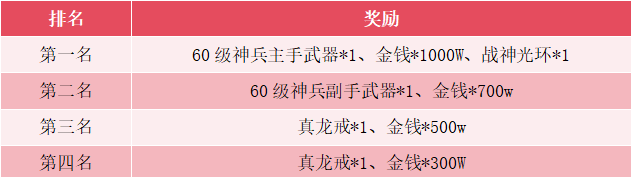 【活动规则】:活动期间内,建立并升级家族,家族等级在本服排名前四的家族可获得对应奖励奖励,等级相同的家族按声望比较排名。