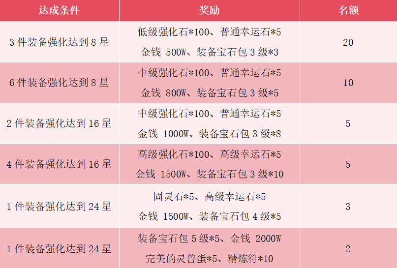 【活动内容】:活动期间角色装备强化达到对应条件,可获得对应奖励,即可联系客服柚子(QQ:99025627)领取对应奖励。