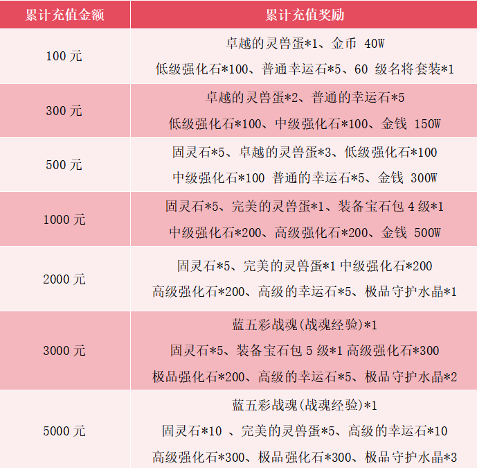 【活动内容】:活动期间内,单账号充值达到累计对应金额,即可领取对应金额奖励,奖励将会以邮件的形式发放到游戏邮箱内,邮箱最多展示三页,领取奖励后请删除空邮件后,在继续领取未显示奖励。