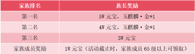 1、活动期间内,建立并升级家族,家族等级在本服排名前三的家族可获得对应奖励奖励,等级相同的家族按声望比较排名。