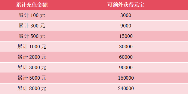 【活动内容】:在活动时间内,单账号累计充值达到对应金额即可获得对应额外元宝哦!