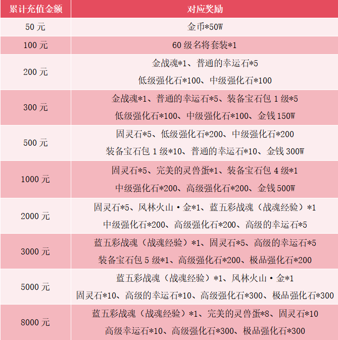 【活动内容】:活动期间内,单账号充值达到累计对应金额,即可领取对应金额奖励,奖励将会以邮件的形式发放到游戏邮箱内,有问题可联系客服柚子(99025627)咨询~
