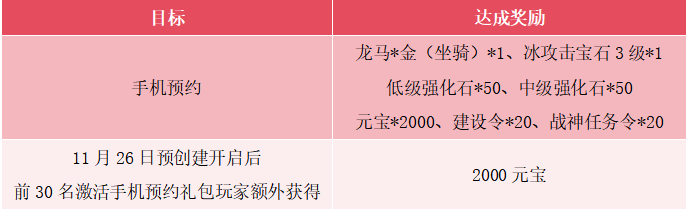 3、活动期间,11月26日预创建开启后,前30名激活手机预约礼包的玩家将额外在获得2000元宝,数量有限,先到先得