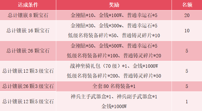 3、宝石镶嵌达标奖励有对应名额限制,奖励名额领取完毕后,在达标者无法领取奖励。