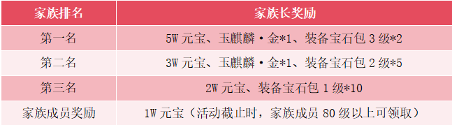 1、活动期间内,建立并升级家族,家族等级在本服排名前三的家族可获得对应奖励奖励,等级相同的家族按声望比较排名。