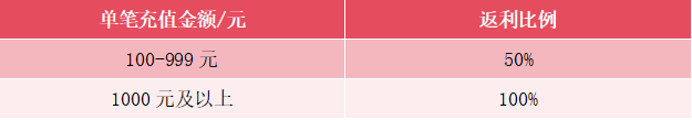 2、参与返利活动的充值金额需为整额。具体规则如下: