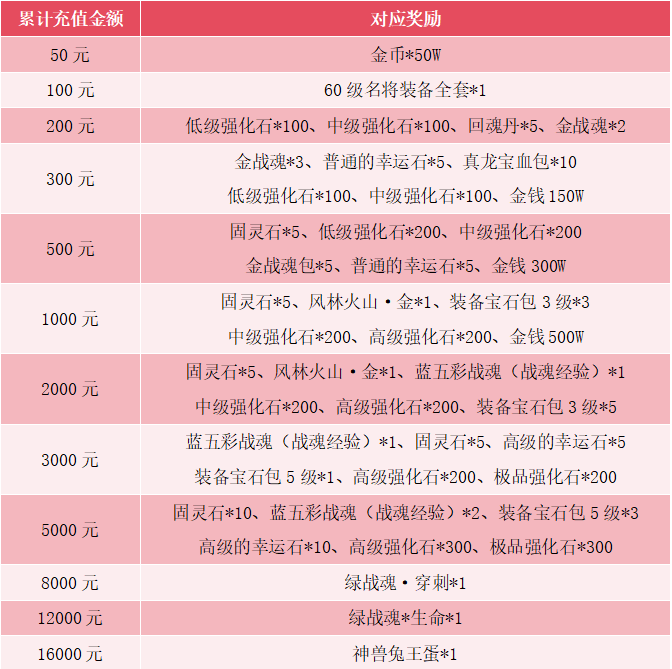 【活动内容】:活动期间内,单账号充值达到累计对应金额,即可领取对应金额奖励,奖励将会以邮件的形式发放到游戏邮箱内,有问题可联系客服柚子(99025627)咨询~
